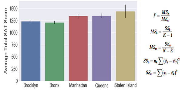 The resulting pvalue was less than 0.05. We can reject the null hypothesis and conclude that there is a significant difference between the SAT scores for each district. Even though we’ve obtained a very low p-value, we cannot make any assumptions about the magnitude of the effect. Also scipy does not calculate $SS_b$ and $SS_w$, so it is probably better to write our own code.