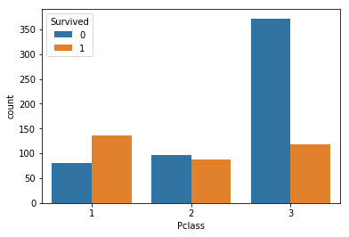 | sns.countplot(train['Pclass'], hue=train['Survived'])